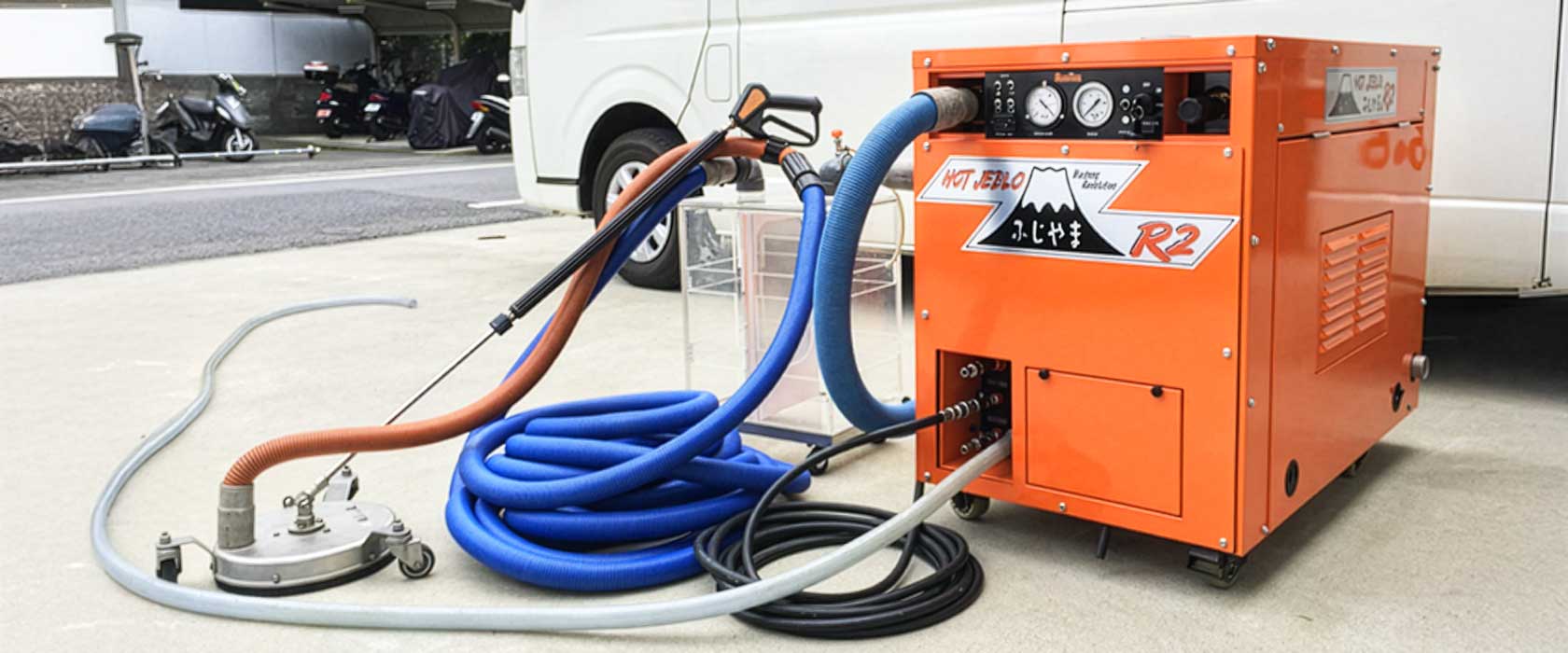 3工程一体型マシン(温水+高圧洗浄+汚水回収)の 『ふじやまR2』を導入。高出力エンジンと150m吸引ホースの機動力で活躍しています。